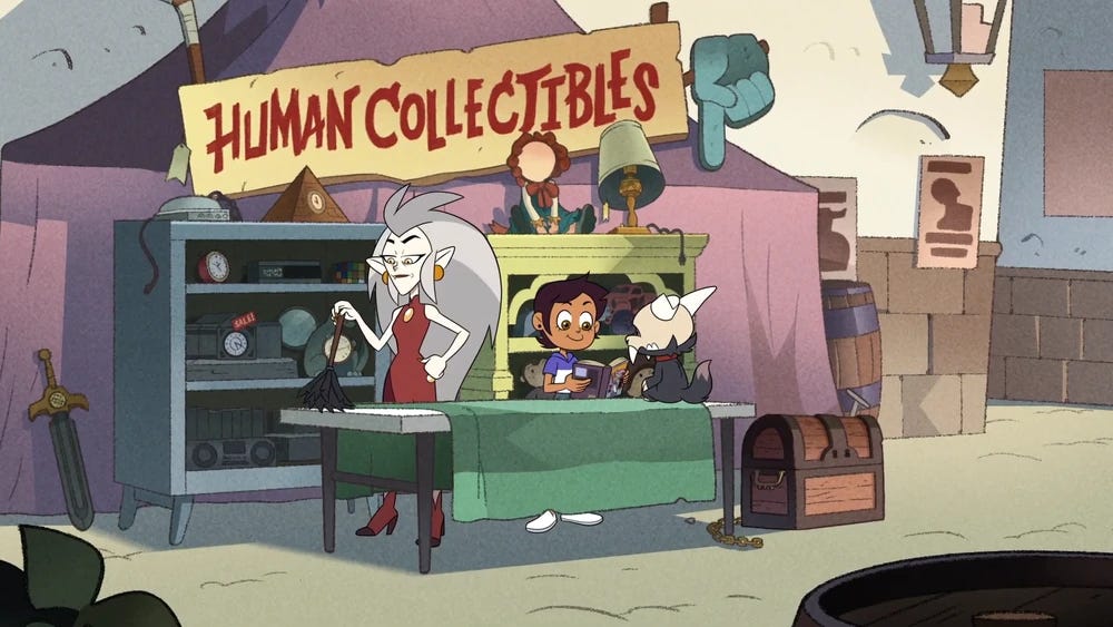 Another notable location from the Owl house is the location of the town called Bonesborough. This is the main town, near where Luz lives in the owl house where the characters Luz, Eda, and King live. In Bonesborough is a market that Eda goes to regularly to sell things from her human item collection. This is a cool detail because throughout the show we see how witches who use magic for almost everything would see human contraptions made without magic.